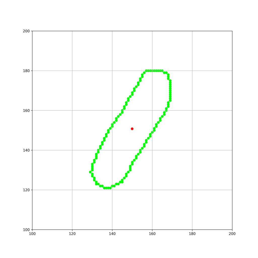 [[136, 121], [135, 122], [134, 122], [133, 123], [132, 123], [132, 124], [131, 125], [131, 126], [130, 127], [130, 128], [129, 129], [130, 130], [130, 131], [130, 132], [130, 133], [131, 134], [131, 135], [132, 136], [132, 137], [132, 138], [133, 139], [133, 140], [134, 141], [134, 142], [135, 143], [135, 144], [136, 145], [136, 146], [137, 147], [137, 148], [138, 149], [138, 150], [139, 151], [140, 152], [140, 153], [141, 154], [142, 155], [142, 156], [143, 157], [144, 158], [145, 159], [145, 160], [146, 161], [146, 162], [147, 163], [147, 164], [148, 165], [148, 166], [149, 167], [150, 168], [150, 169], [151, 170], [151, 171], [152, 172], [153, 173], [153, 174], [154, 175], [154, 176], [155, 177], [155, 178], [156, 179], [157, 180], [158, 180], [159, 180], [160, 180], [161, 180], [162, 180], [163, 180], [164, 180], [165, 180], [166, 179], [167, 179], [168, 178], [168, 177], [168, 176], [169, 175], [169, 174], [169, 173], [169, 172], [169, 171], [169, 170], [169, 169], [169, 168], [169, 167], [169, 166], [169, 165], [168, 164], [168, 163], [168, 162], [167, 161], [167, 160], [166, 159], [166, 158], [165, 157], [164, 156], [164, 155], [163, 154], [162, 153], [162, 152], [161, 151], [161, 150], [160, 149], [159, 148], [159, 147], [158, 146], [157, 145], [157, 144], [156, 143], [156, 142], [155, 141], [154, 140], [154, 139], [153, 138], [152, 137], [152, 136], [151, 135], [150, 134], [150, 133], [149, 132], [149, 131], [149, 130], [148, 129], [147, 128], [147, 127], [146, 126], [145, 125], [145, 124], [144, 124], [143, 123], [142, 123], [141, 122], [140, 122], [139, 121], [138, 121], [137, 121]]この細胞の情報をpythonで可視化してみます。
