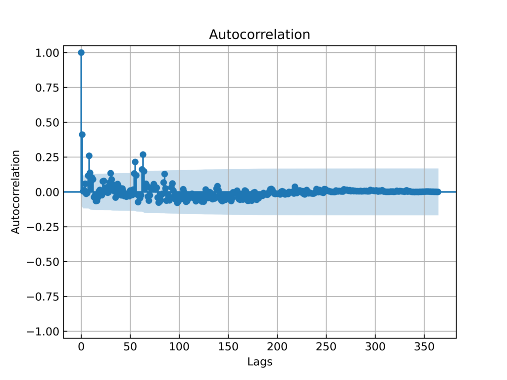 上図を見ると、ラグ1の自己相関が0.4付近であることから、ある日の降水量が高い場合、次の日も雨であることが多いことがわかります。