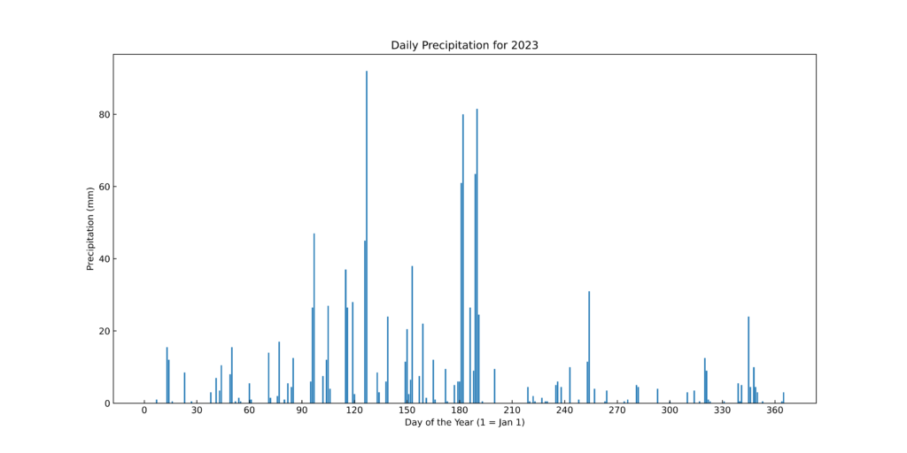 上記のJSONデータから、2023年全ての日付の曜日ごとの降水量を抽出します。