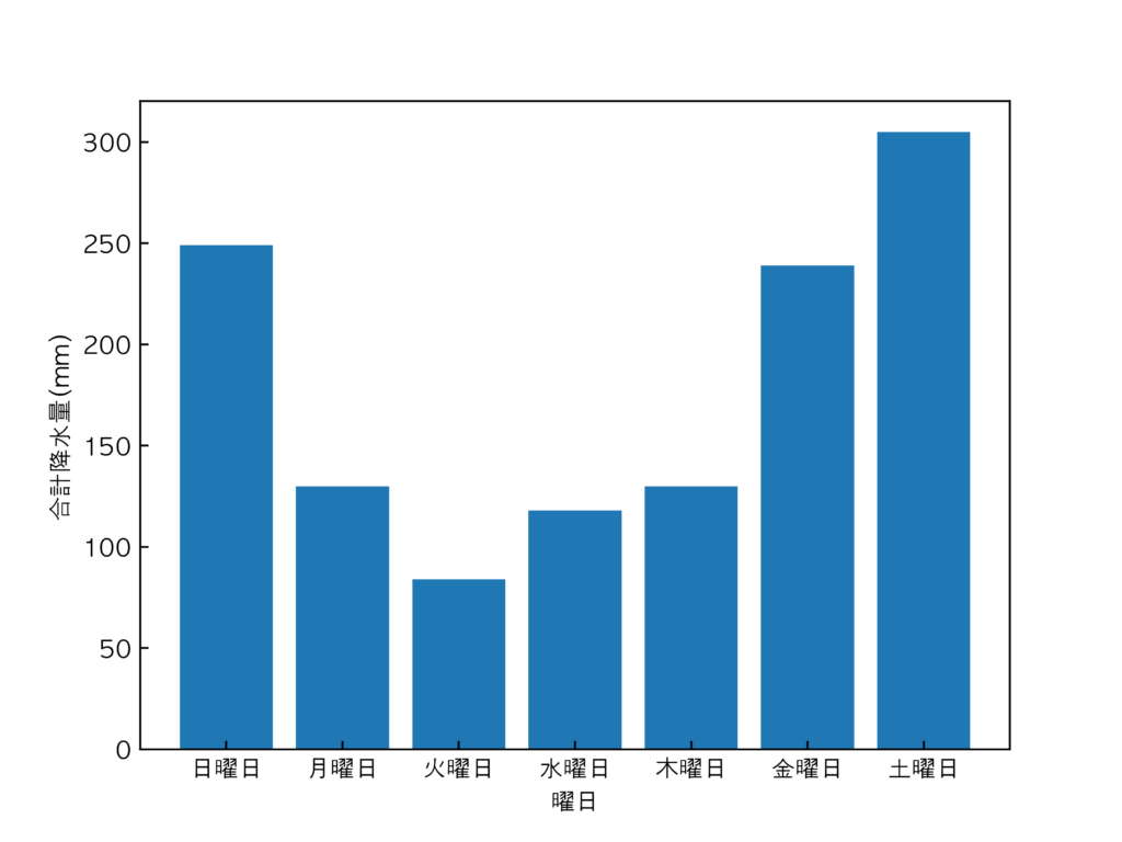 {'月曜日': [0.5, 8.5, 10.5, 1.5, 11.5, 5.0, 24.5, 4.5, 31.0, 4.5, 3.0, 0.5, 0.5, 24.0], '火曜日': [3.0, 0.5, 1.0, 37.0, 20.5, 7.5, 0.5, 1.5, 1.0, 1.0, 5.5, 4.5, 0.5], '水曜日': [5.5, 6.0, 7.5, 26.5, 2.5, 12.0, 9.5, 6.0, 26.5, 0.5, 9.5, 5.0, 0.5, 0.5], '木曜日': [1.5, 1.0, 5.5, 26.5, 6.0, 6.5, 22.0, 1.0, 0.5, 6.0, 2.0, 0.5, 6.0, 10.0, 4.0, 3.5, 12.5, 5.0, 10.0], '金曜日': [15.5, 0.5, 7.0, 0.5, 2.0, 47.0, 12.0, 24.0, 38.0, 61.0, 9.0, 0.5, 0.5, 4.0, 0.5, 3.5, 9.0, 4.5], '土曜日': [1.0, 12.0, 8.0, 17.0, 4.5, 27.0, 28.0, 45.0, 8.5, 1.5, 80.0, 63.5, 4.5, 1.0, 3.0, 0.5], '日曜日': [3.5, 15.5, 14.0, 12.5, 4.0, 2.5, 92.0, 3.0, 81.5, 11.5, 0.5, 5.0, 0.5, 3.0]}抽出したデータから、曜日ごとの1年間の合計降水量を可視化してみます。