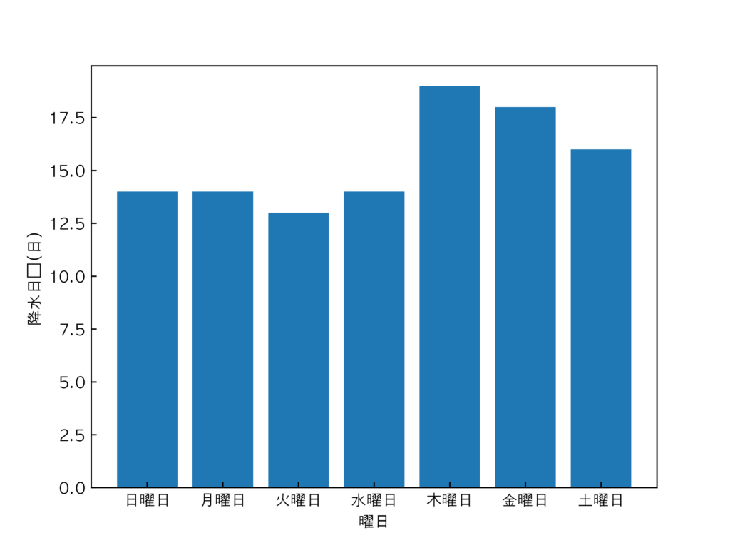 降水頻度で見ると木曜日が一番高いことがわかりました。