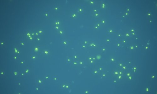 今回利用する細胞は、EBPRリアクターから採取した微生物です。リン酸をポリリン酸の形で蓄積するため、DAPI染色で黄色の蛍光を発します。