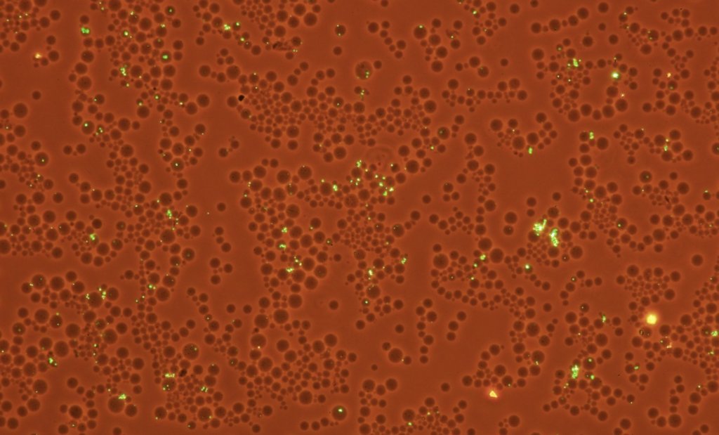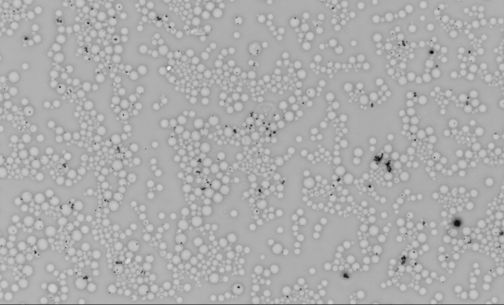 また、泡のようなものがゲルで実際は球体になっていますが、顕微鏡写真では微分干渉で見ていないので平面的に見えます。