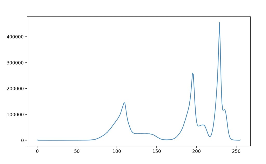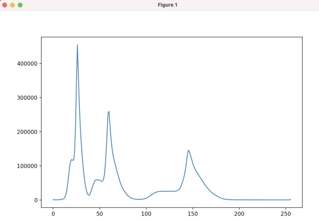 続いてこの反転グレースケール画像のヒストグラムを解析します。
