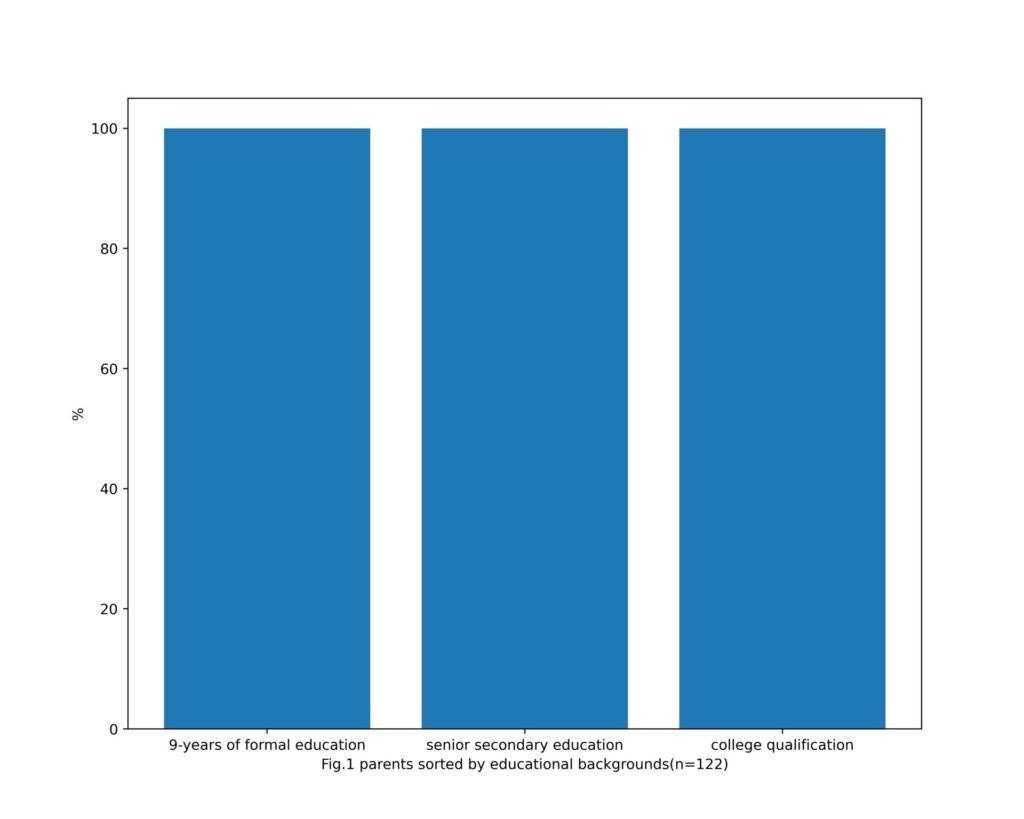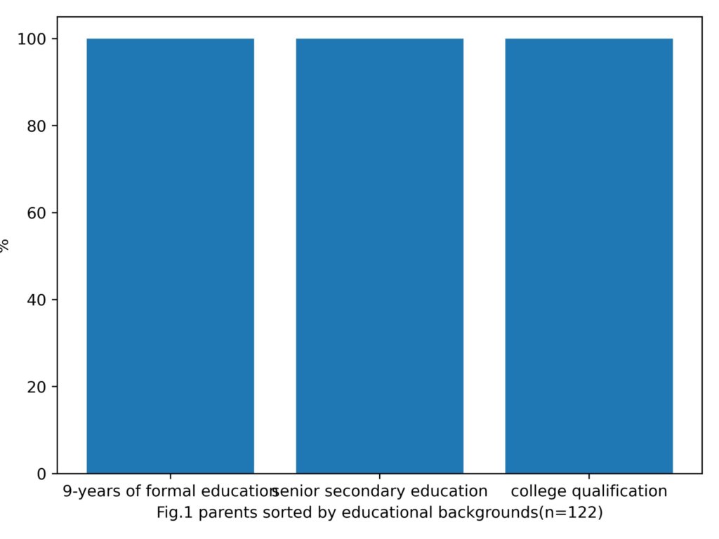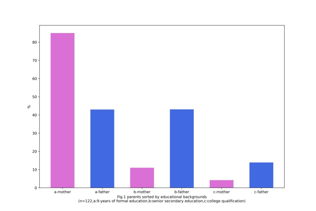 plt.xlabel('Fig.1 parents sorted by educational backgrounds\n(n=122,a:9-years of formal education,b:senior secondary education,c:college qualification)')