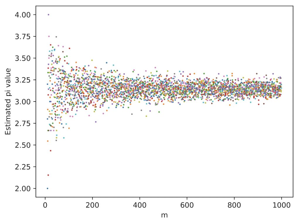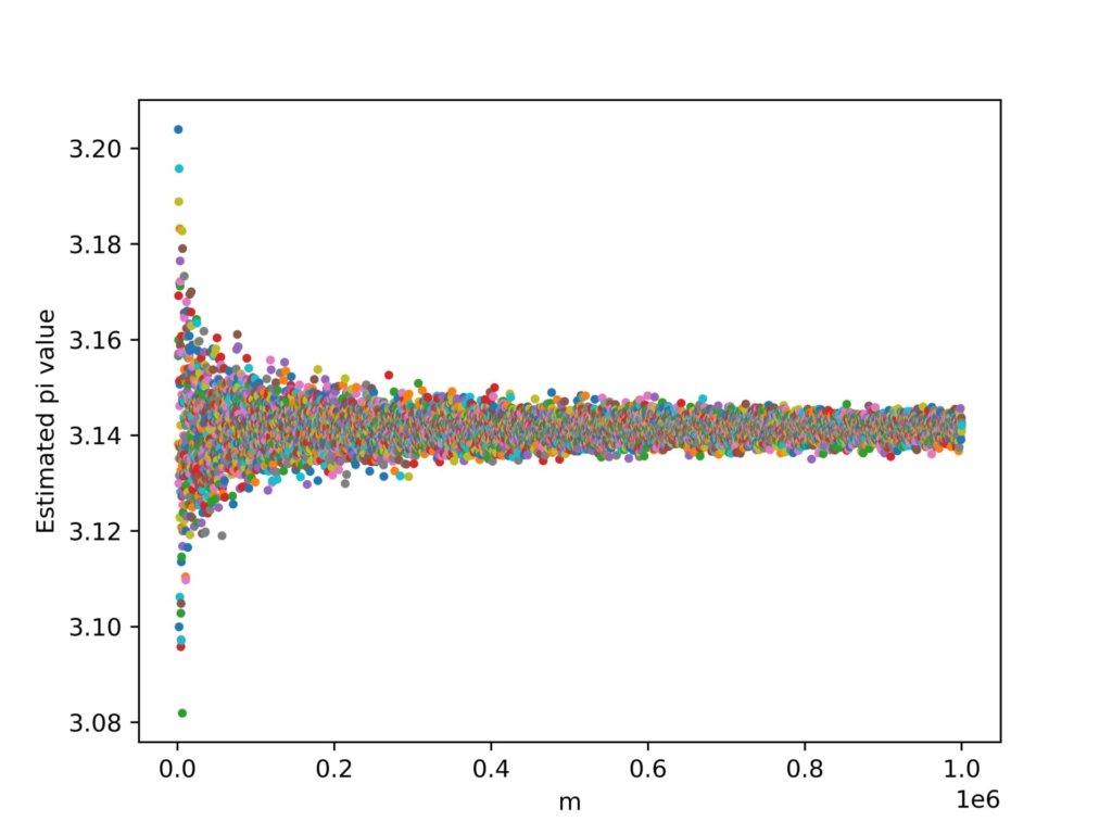 モンテカルロ法を使用して、試行回数mの時の円内に存在する座標数を計算して、piの近似値を出力します。この時、randintメソッドが閉区間であることに注意します。