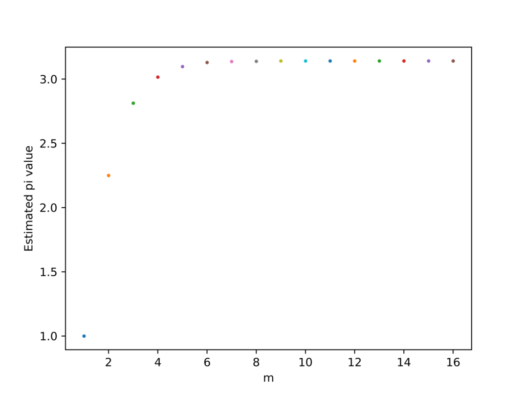 nが増加するほどある一定の値に漸近していっていることがわかります。このことから、計算量を増やせば増やすほど、正確な円周率を求められることがわかります。
