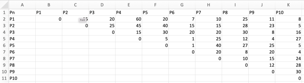 このとき、エクセル上では左下半分を埋めていないため、転置行列を使用してデータを補完します。