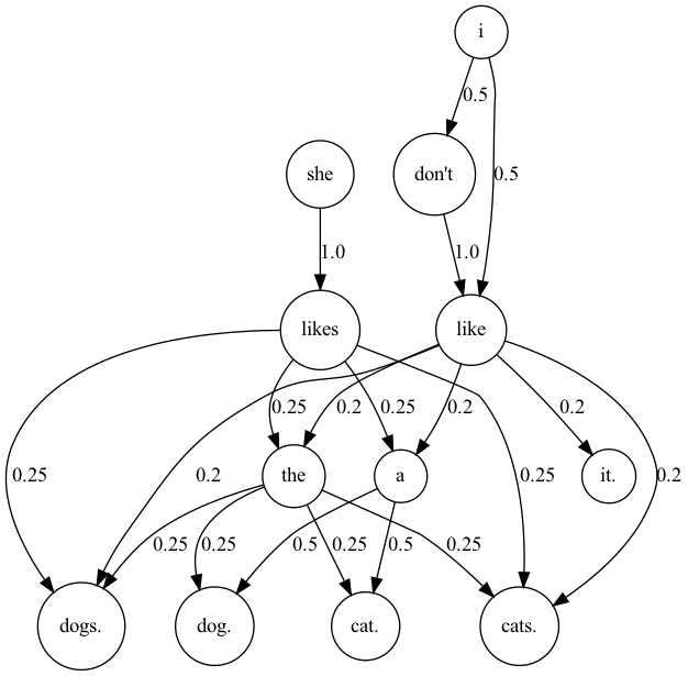 edges = {(i,j):str(1/len(list(set(chain[i]))))[:4] if len(chain[i]) !=0 else "0" for i in chain for j in chain[i]}