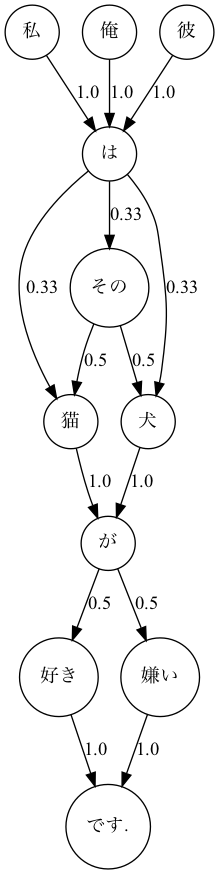 この記事では、文章に対するマルコフ連鎖を抽出した後、Graphvizを使用して単語の遷移を確率付きで可視化します。
