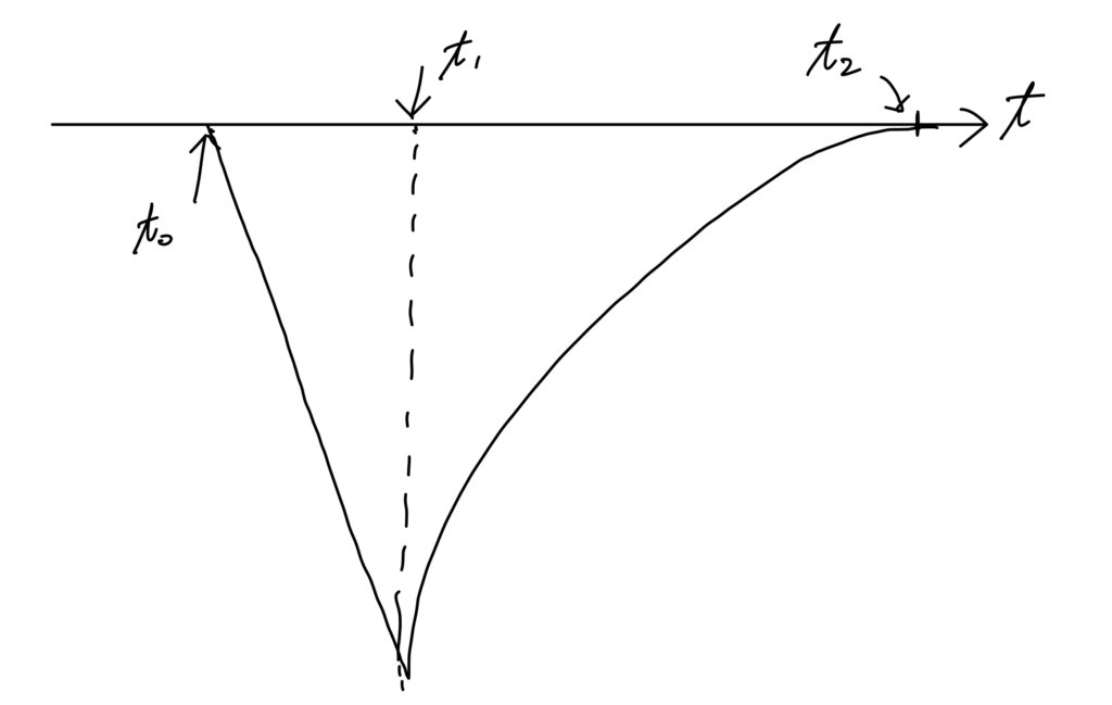 上記のグラフ(縦軸はOD)の$t_0$時点で通気を停止した後、$t_1$で通気を再開すると、$t_2$までの間、ODはカーブを描きながら定常値に戻っていきます。