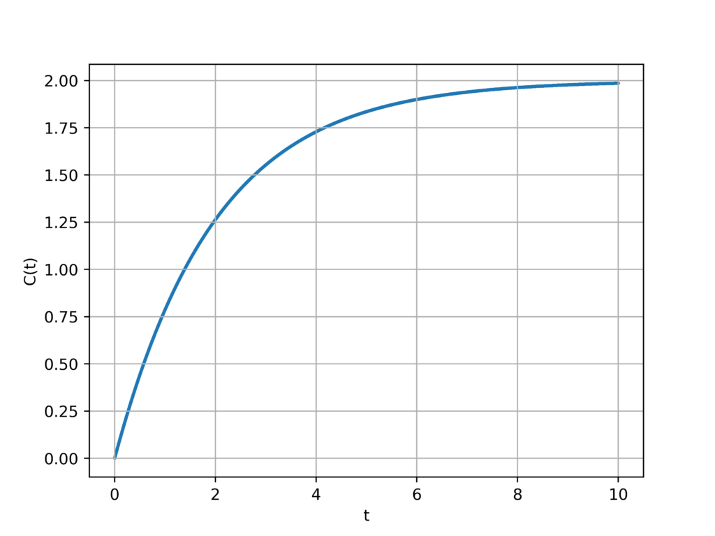 ここで、時刻tの時の$ \bar{C}-C(t)$が$\frac{ \bar{C}-C(t)}{e}$となるまでの時間を$\tau (h)$とすると、